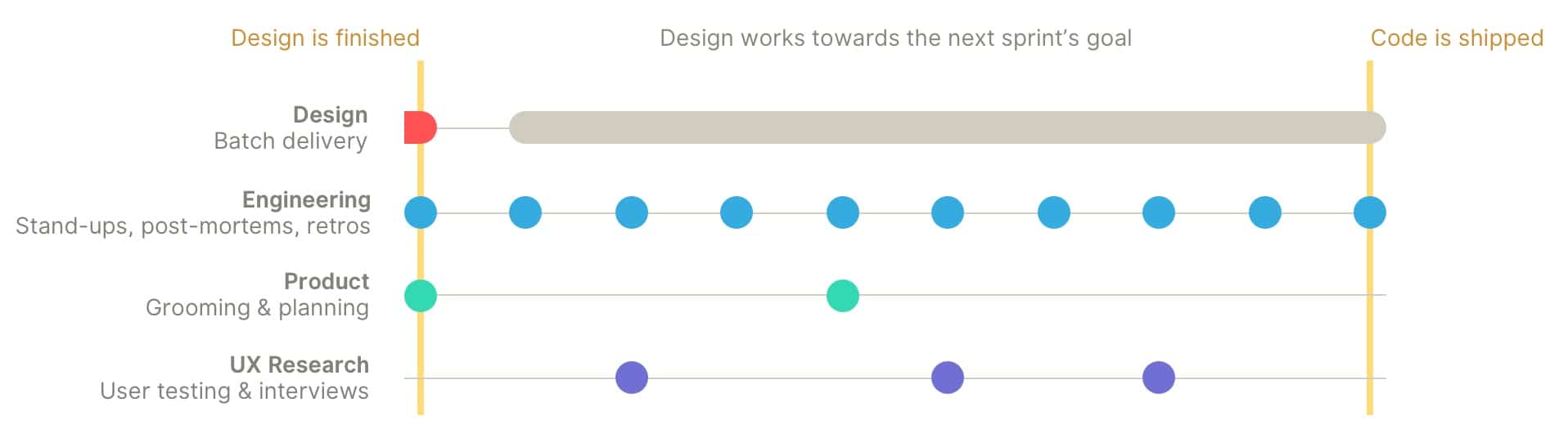 In response to this disconnect, designers are often working at least one sprint ahead of engineers. While one sprint might not seem like much of a lag, a typical product team learns a lot after the design hand-off.